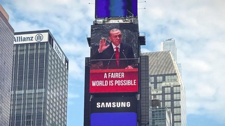 Cumhurbaşkanı Erdoğan’ın ‘Daha Adil Bir Dünya Mümkün’ sözü, Times Meydanı’ndaki ekranlarda
