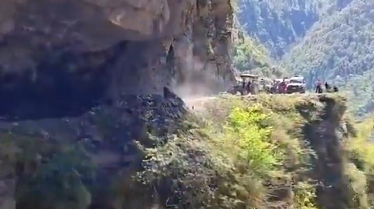 Yol kenarında bulunan devasa bir kaya parçası, saniyeler içinde aniden çöktü. Parçalanarak uçurumdan düşen dev kaya parçasının düşüşü sırasında bölgede bulunanlar büyük bir tehlike atlattı. Yerel halkın dikkati ise muhtemel bir facianın önüne geçti. Bölge sakinleri, kaya düşmesinden önce küçük taşların yuvarlanmaya başladığını fark ederek sürücüleri uyardı. Araçların zamanında durdurulması sayesinde herhangi bir can kaybı ya da yaralanma yaşanmadı.